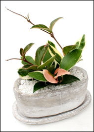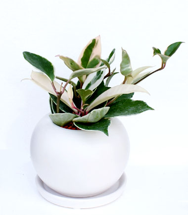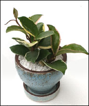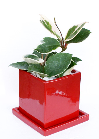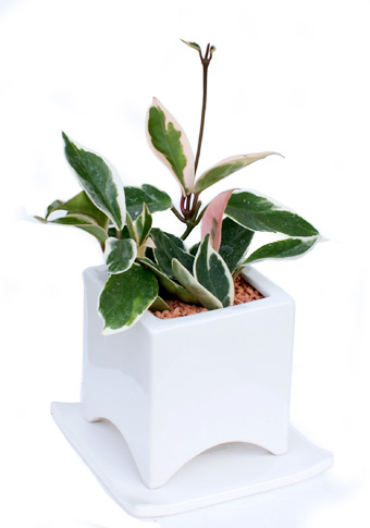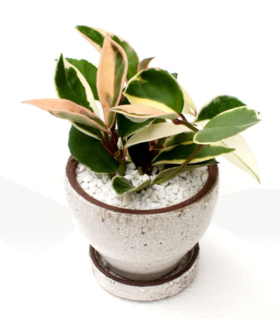 ホヤ・カルノーサ(斑入りサクララン) (Hoya carnosa) 科名:ガガイモ科科ホヤ属 原産地:日本南部、中国〜豪州 光沢のある多肉質の葉が美しく時に赤味を帯びることもあります。 つるを長く伸ばすと半球状に白っぽい桜色の花を咲かせ 明るい場所に置き水をやりすぎなければ丈夫なグリーンです。