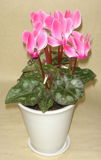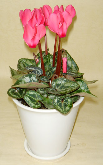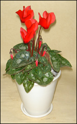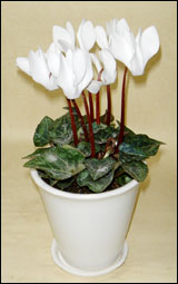シクラメン ポット (ソーサー付) 税込 \1,470 ラッピング 写真で見てもらってもわかると思うのですが 花の色に深みがあり、きれいな色の出ている 新潟県南魚沼で精魂こめて作っている上質なシクラメンを シンプルなホワイトポットに植えました。 3月くらいまでは花を楽しめ 心をなごませてくれるキュートなグリーンです。 鉢直径10.5cm、高さ10.5cm 植物:約幅13×高さ18〜20cm 重さ 700g